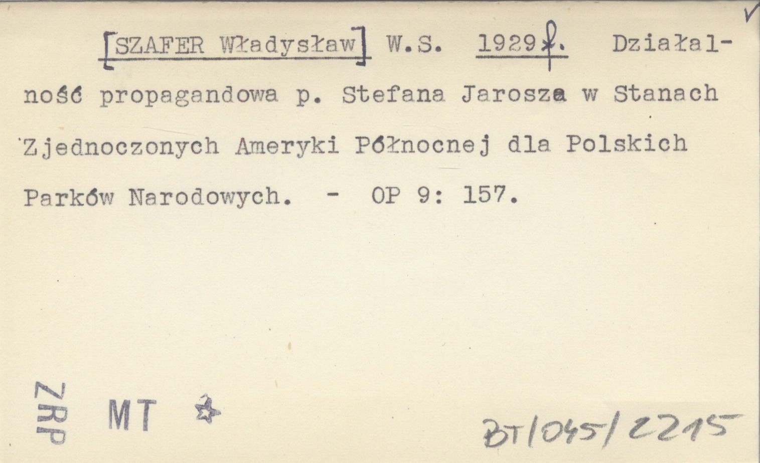 W. S. [SZAFER Władysław] 1929 f Działalność propagandowa p. Stefana Jarosza w Stanach Zjednoczonych Ameryki Północnej dla Polskich Parków Narodowych.