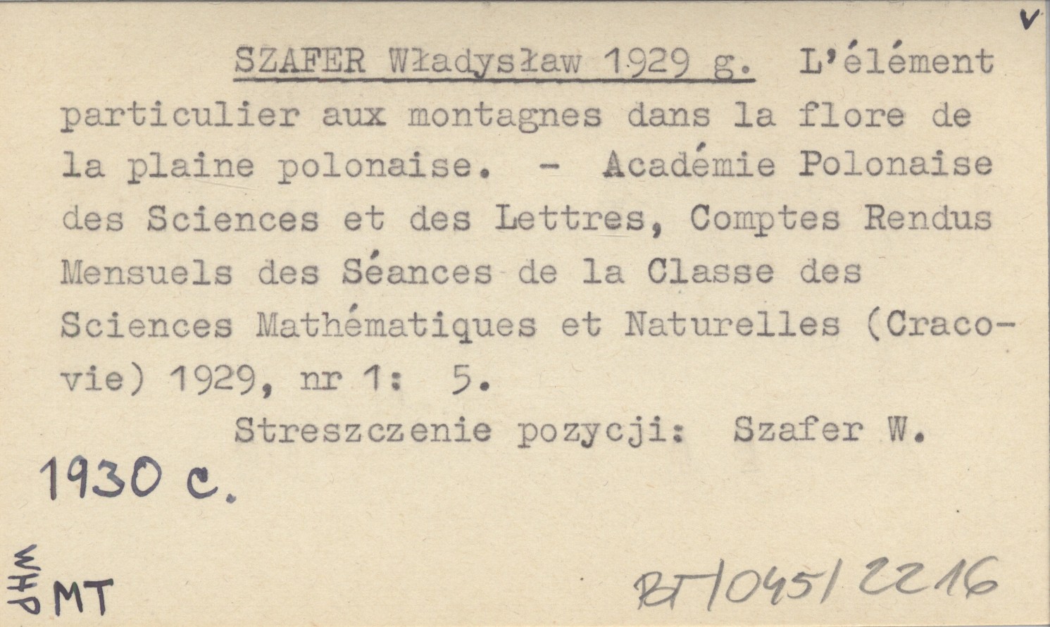 Académie Polonaise des Sciences et des Lettres, Comptes Rendus Mensuels des Séances de la Classe des Sciences Mathématiques et Naturelles (Cracovie) , Nr 1: 5. Streszczenie pozycji: SZAFER W. 1930 c.