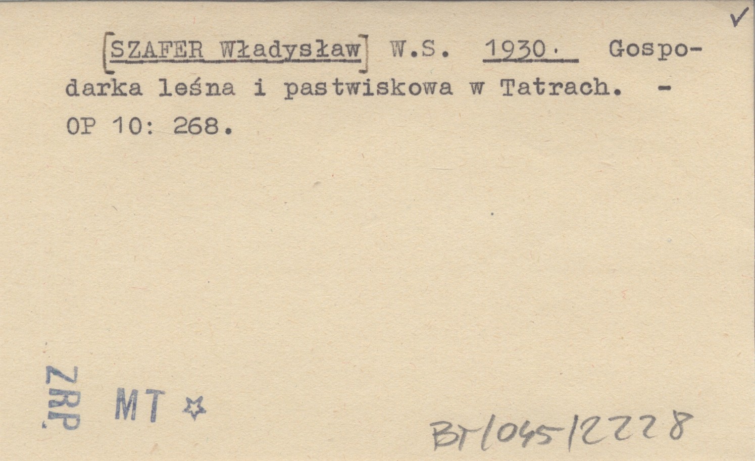 W. S. [SZAFER Władysław] 1930 Gospodarka leśna i pastwiskowa w Tatrach.