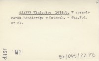 SZAFER Władysław 1934 b W sprawie Parku Narodowego w Tatrach.