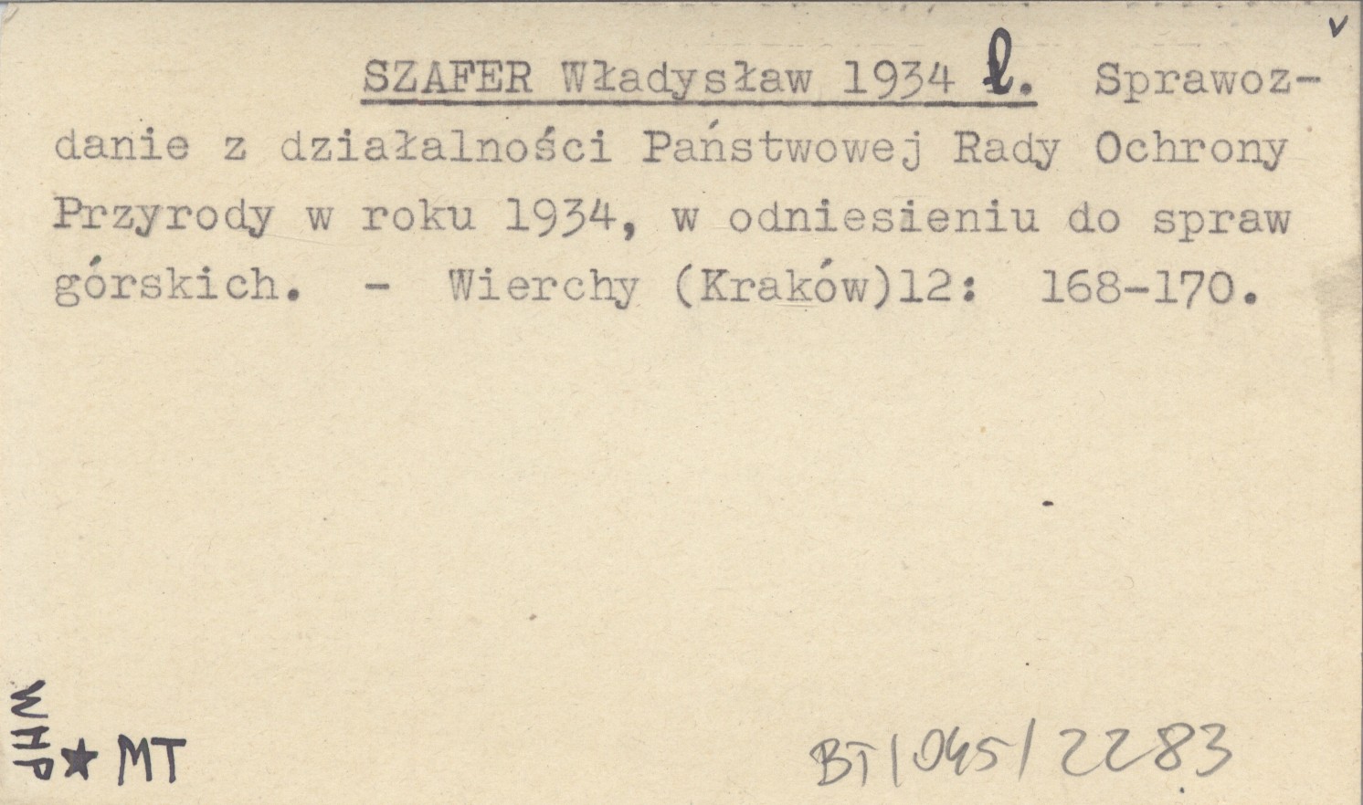 SZAFER Władysław 1934 l Sprawozdanie z działalności Państwowej Rady Ochrony Przyrody w roku 1934, w odniesieniu do spraw górskich.
