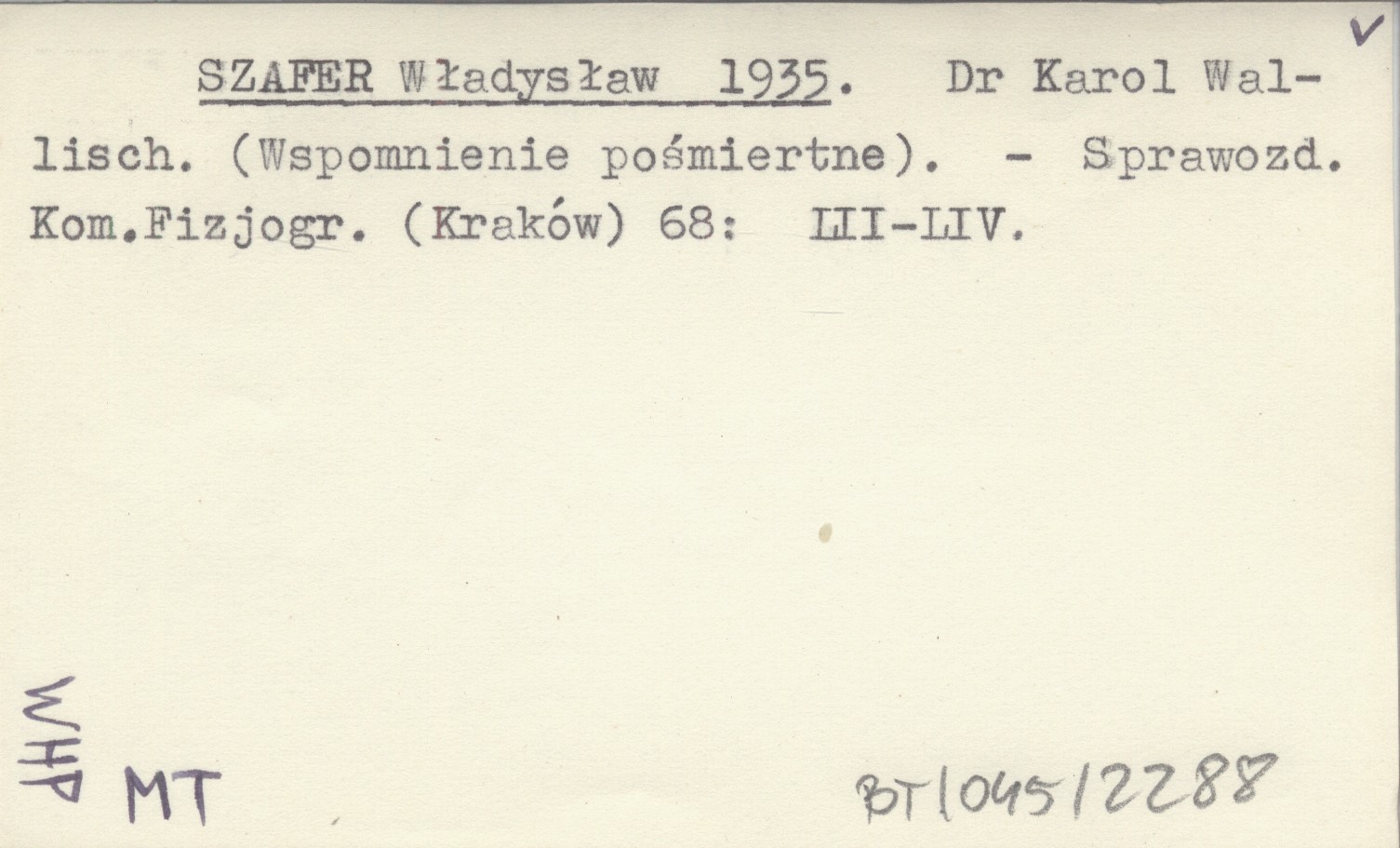 SZAFER Władysław 1935 Dr Karol Wallisch. (Wspomnienie pośmiertne).