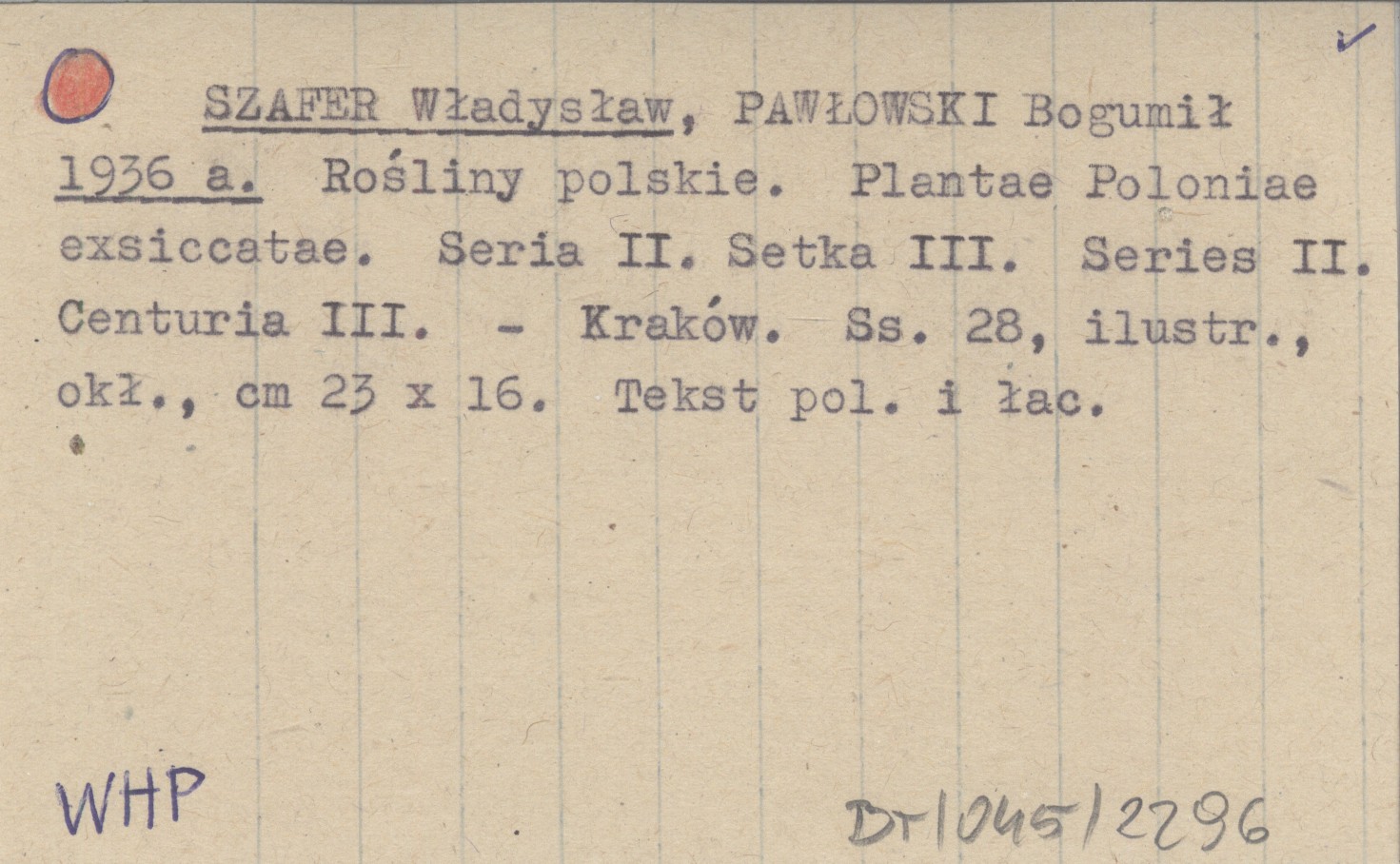 SZAFER Władysław PAWŁOWSKI, Bogumił. ; 1936 a Rośliny polskie. Plantae Poloniae exsiccatae. Seria II. Setka III. Series II. Centuria III.