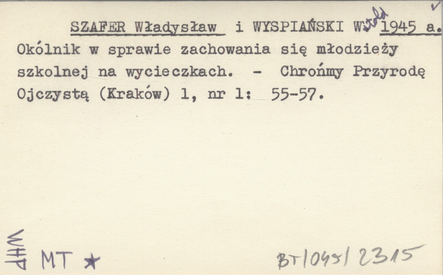 SZAFER Władysław WYSPIAŃSKI, Witold. ; 1945 a Okólnik w sprawie zachowania się młodzieży szkolnej na wycieczkach.