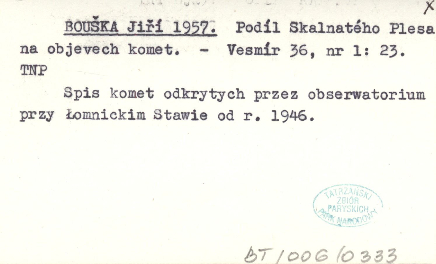 BOUŠKA Jiří 1957 Podíl Skalnatého Plesa na objevech komet.