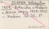 SZAFER Władysław 1959 Botanika w Krakowie w okresie wojny 1939-1945.