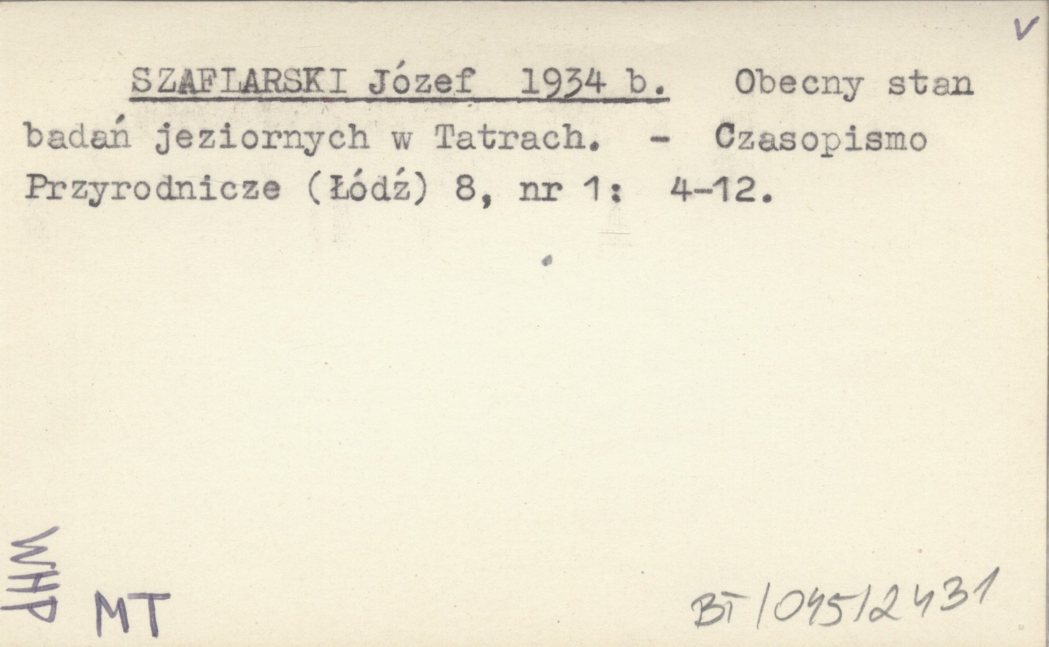 SZAFLARSKI Józef 1934 b Obecny stan badań jeziornych w Tatrach.