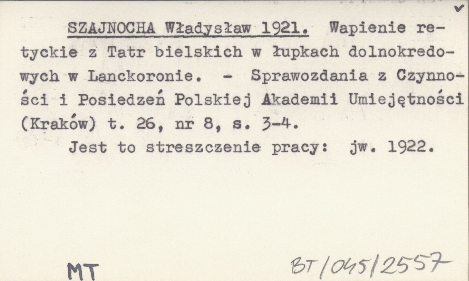 SZAJNOCHA Władysław 1921 Wapienie retyckie z Tatr bielskich w łupkach dolnokredowych w Lanckoronie.