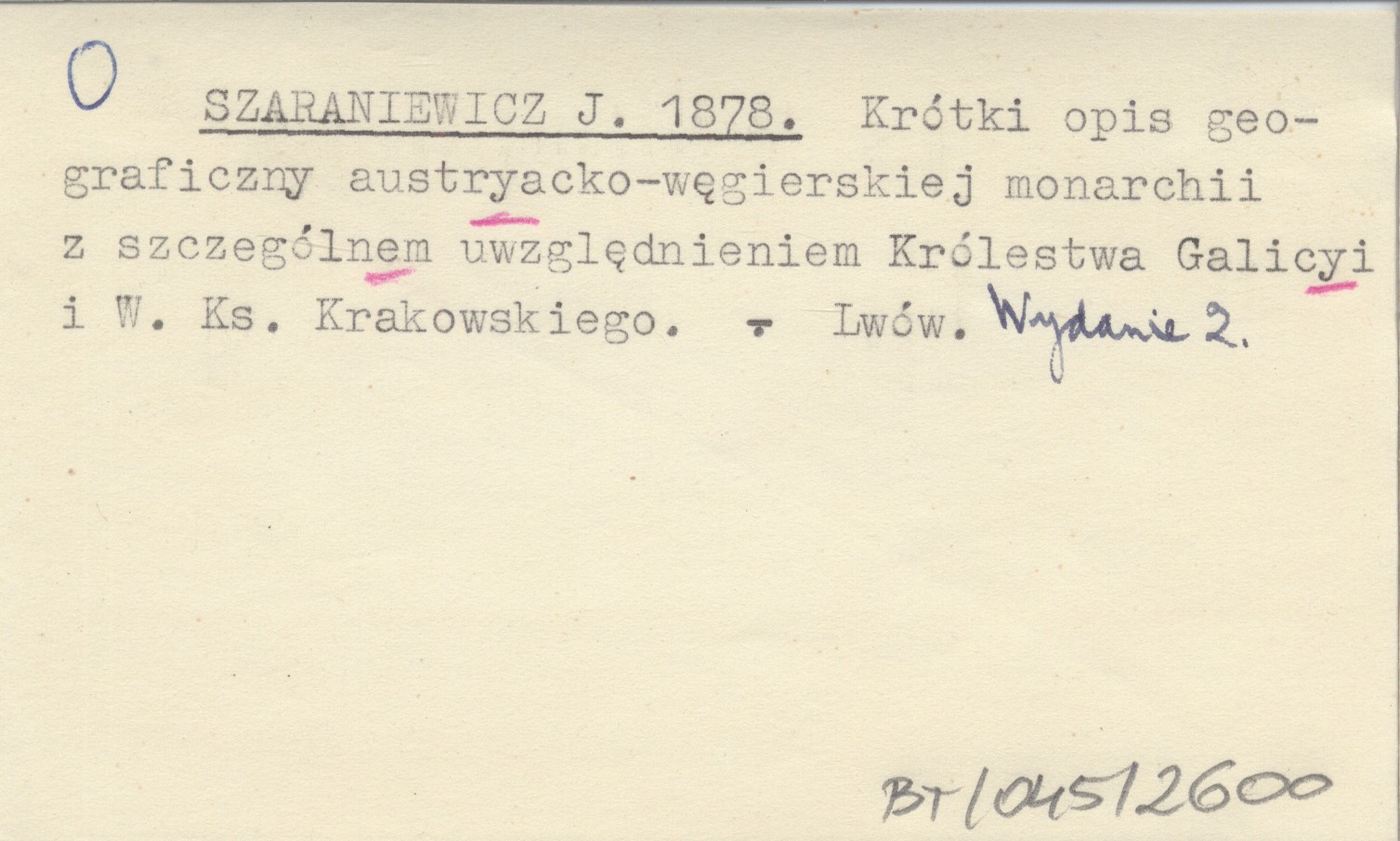 SZARANIEWICZ J. 1878 Krótki opis geograficzny austryacko-węgierskiej monarchii z szczególnem uwzględnieniem Królestwa Galicyi i W. Ks. Krakowskiego.