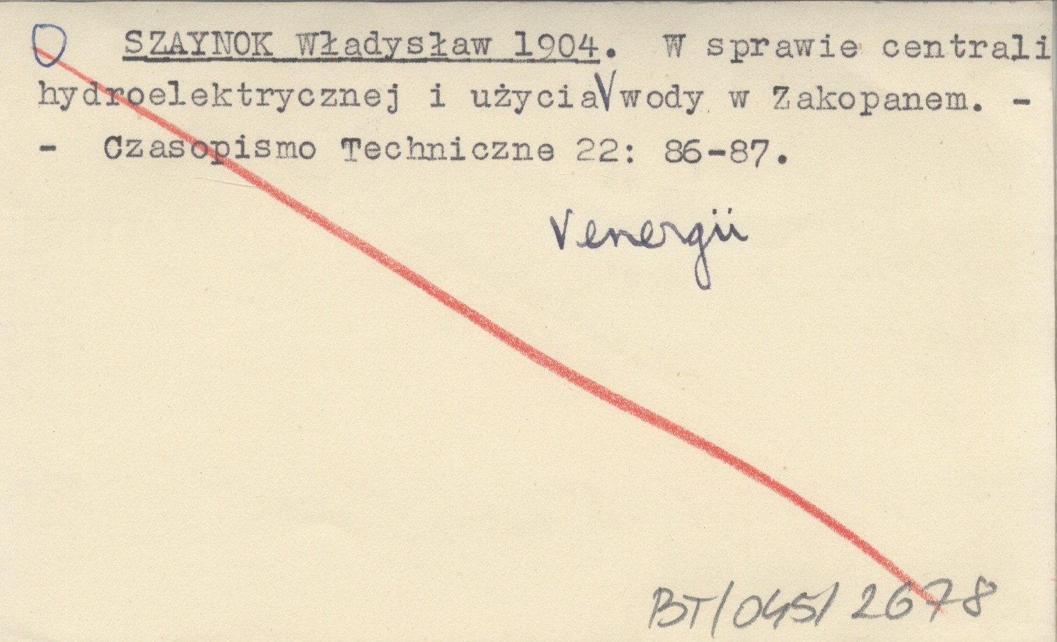 SZAYNOK Władysław 1904 W sprawie centrali hydroelektrycznej i użycia energii wody w Zakopanem.