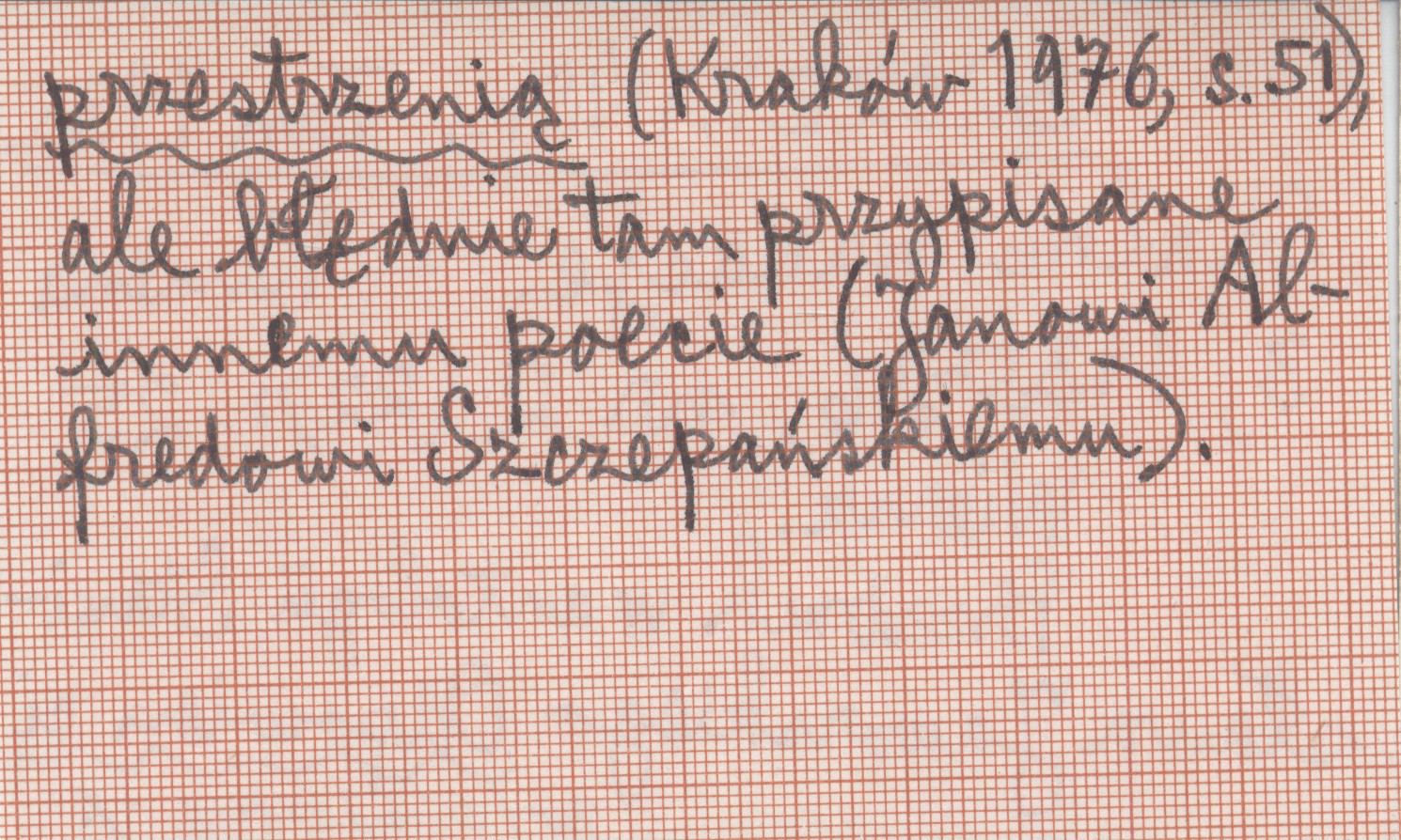 Kamena, 3 (1935-1936), nr 2 (22): 25. Wiersz. Przedruk w antologii Stanisława Jaworskiego Odpowiem ci przestrzenią (Kraków 1976: 51), ale błędnie tam przypisane innemu poecie (Janowi Alfredowi Szczepańskiemu).