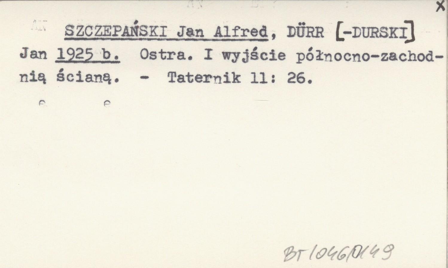 SZCZEPAŃSKI Jan Alfred DÜRR[-DURSKI], Jan. ; 1925 b Ostra. I wyjście północno-zachodnią ścianą.