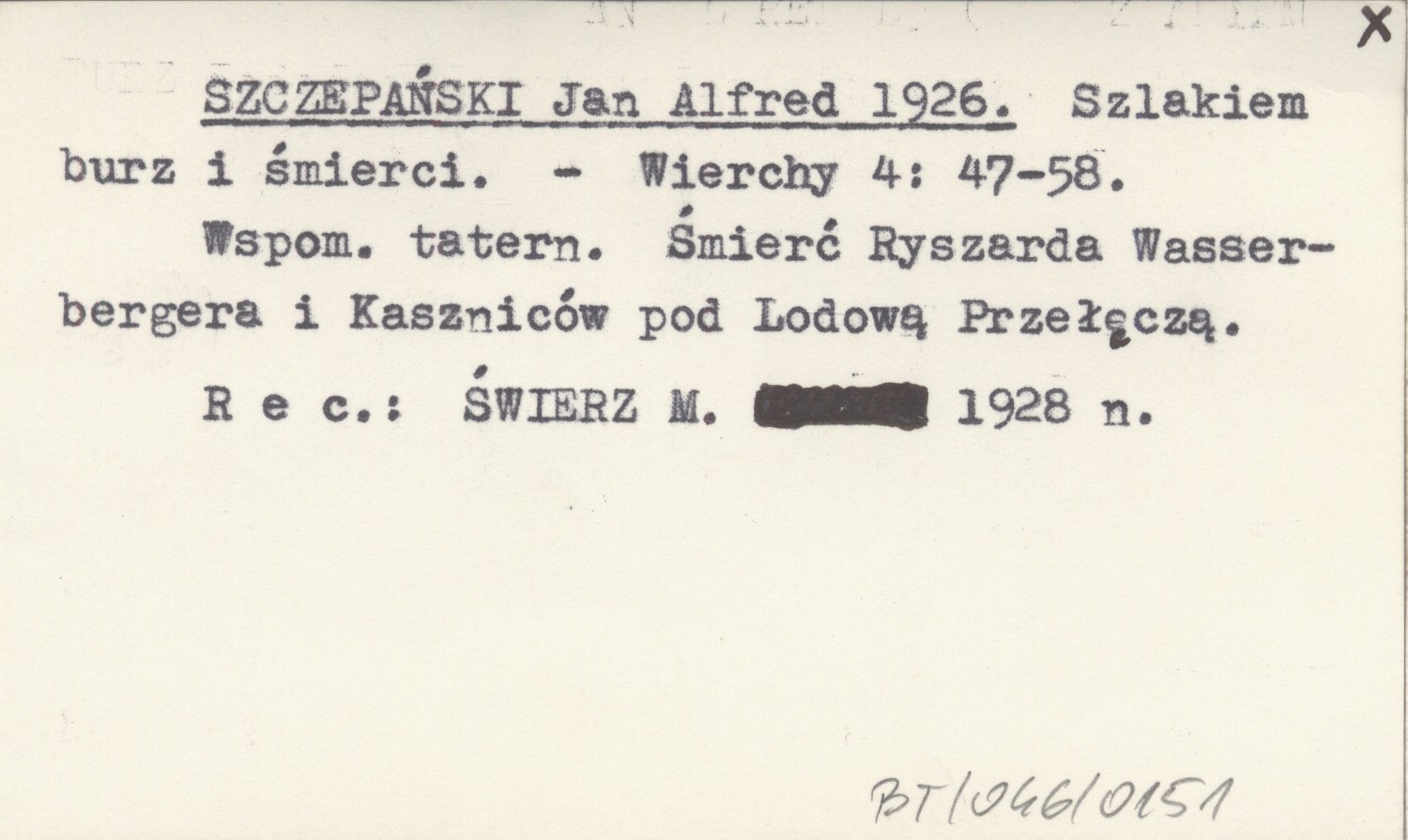 Wierchy, 4: 47-58. Wspomnienie taternickie. Śmierć Ryszarda Wasserbergera i Kaszniców pod Lodową Przełęczą. REC: ŚWIERZ M. 1928 n ; PAZDRO Zdzisław, Przyroda i Technika (Lwów) 6 (1927): 142 ;