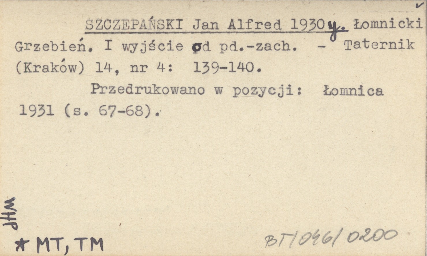 SZCZEPAŃSKI Jan Alfred 1930 y Łomnicki Grzebień. I wyjście od pd.-zach.