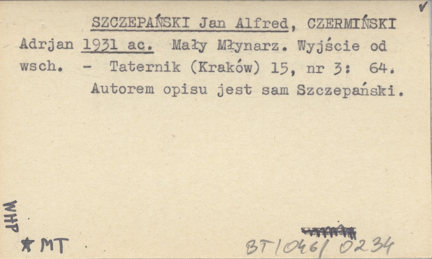 SZCZEPAŃSKI Jan Alfred CZERMIŃSKI, Adrjan. ; 1931 ac Mały Młynarz. Wyjście od wsch.