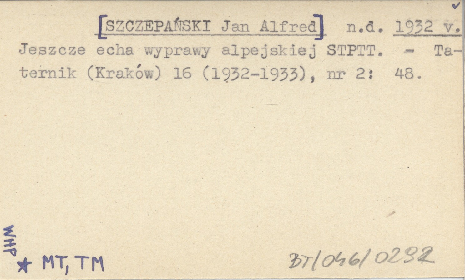 n. d. [SZCZEPAŃSKI Jan Alfred] 1932 v Jeszcze echa wyprawy alpejskiej STPTT.