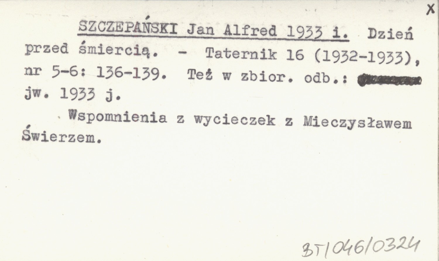 Taternik, 16 (1932-1933), nr 5-6: 136-139. Wspomnienie z wycieczek z Mieczysławem Świerzem. Też w zbior. odb.: jw. 1933 j.