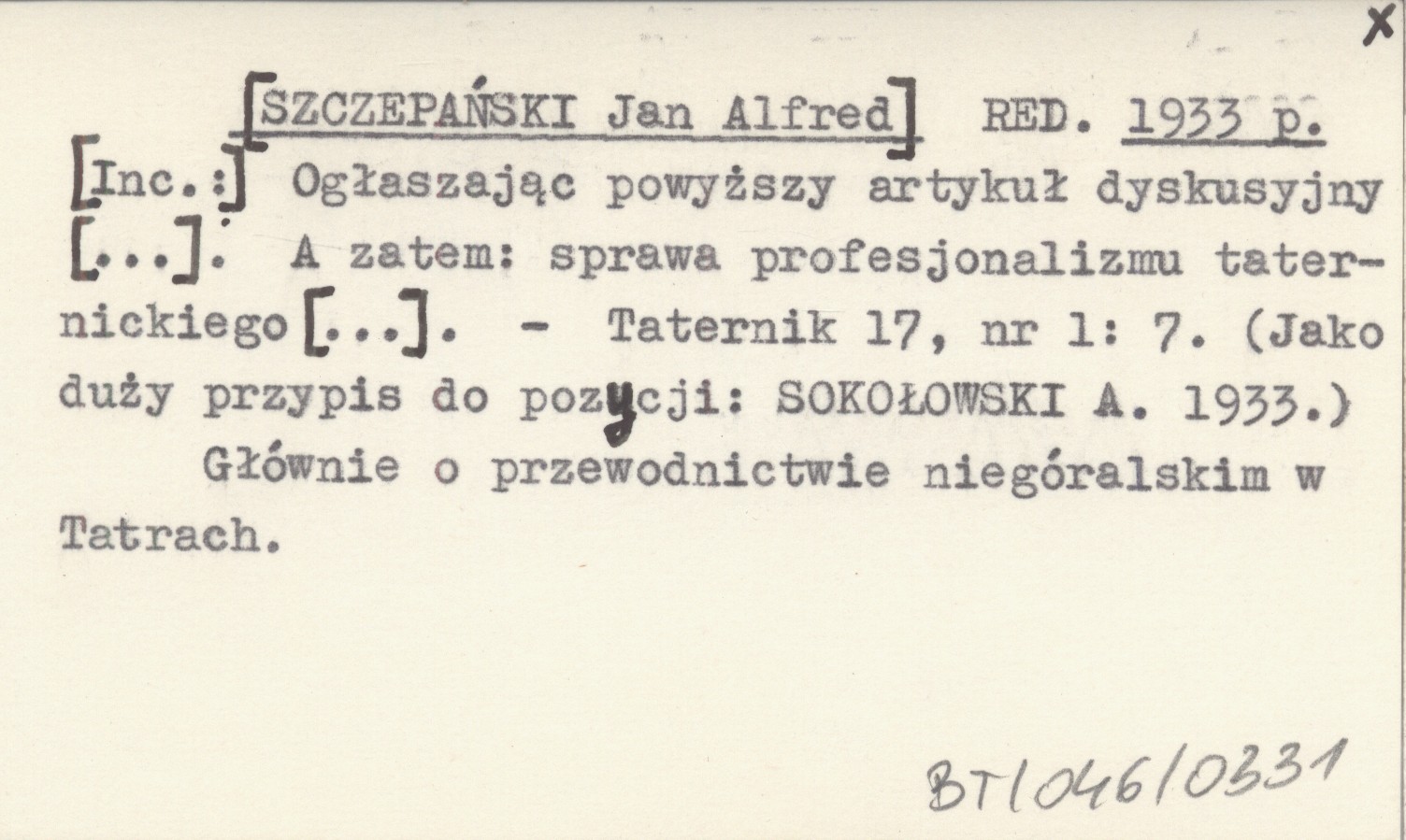 RED. [SZCZEPAŃSKI Jan Alfred] 1933 p [Inc.:] Ogłaszając powyższy artykuł dyskusyjny [...]. A zatem: sprawa profesjonalizmu taternickiego [...].