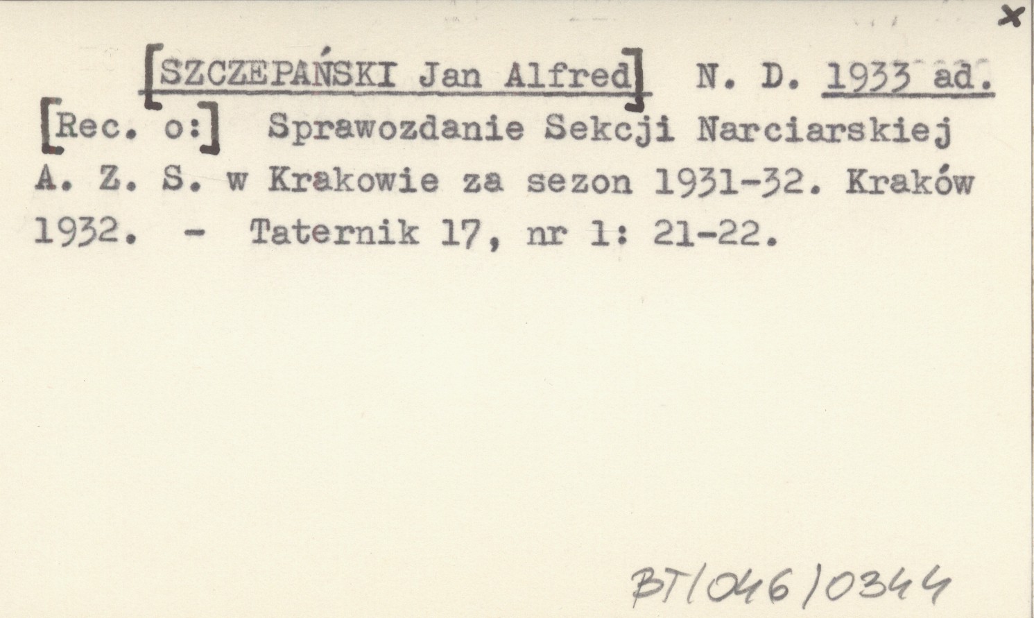 N. D. [SZCZEPAŃSKI Jan Alfred] 1933 ad [Rec. o:] Sprawozdanie Sekcji Narciarskiej A.Z.S. w Krakowie na sezon 1931-32. Kraków 1932.