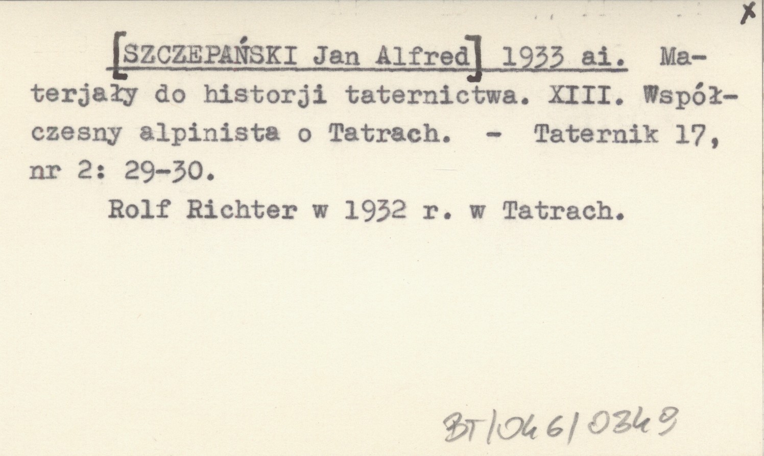 [SZCZEPAŃSKI Jan Alfred] 1933 ai Materjały do historji taternictwa. XIII. Współczesny alpinista o Tatrach.