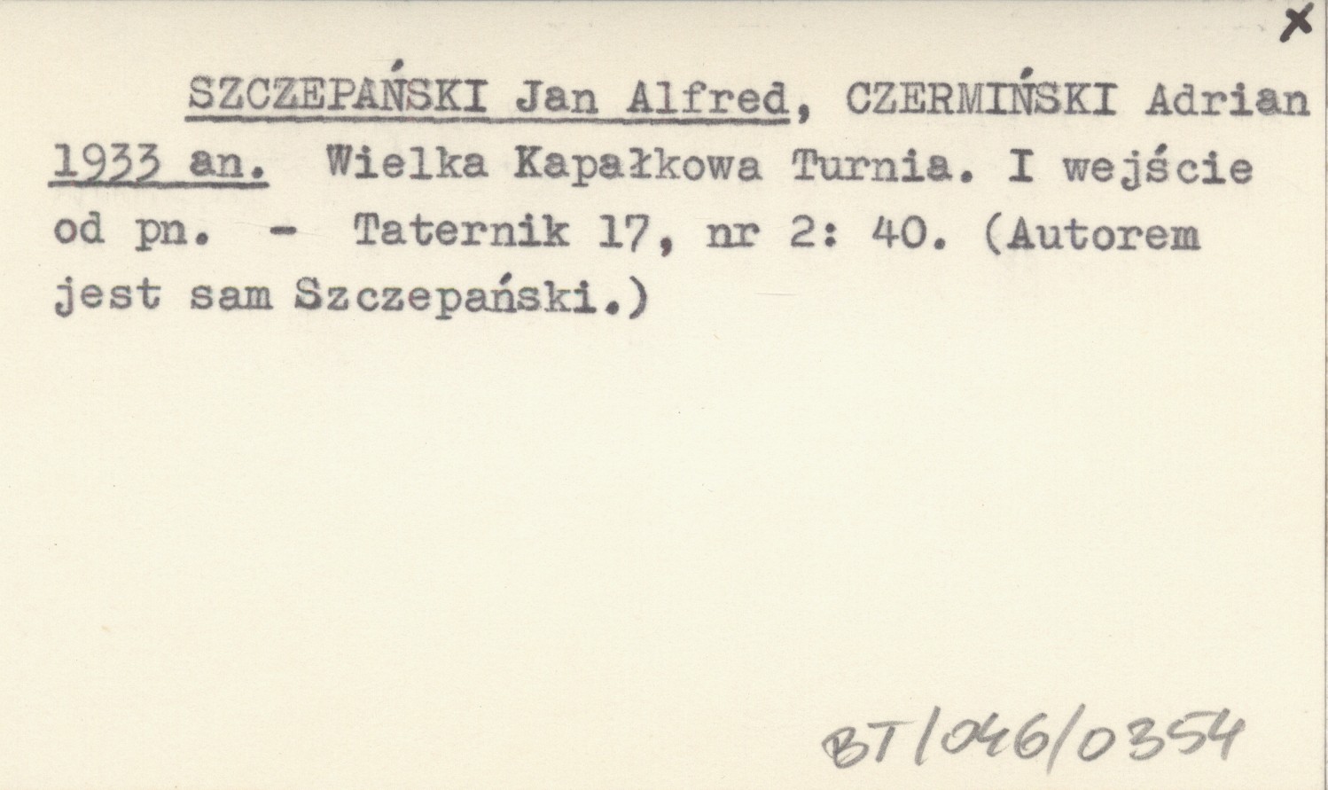 SZCZEPAŃSKI Jan Alfred CZERMIŃSKI, Adrian. ; 1933 an Wielka Kapałkowa Turnia. I wejście od pn.