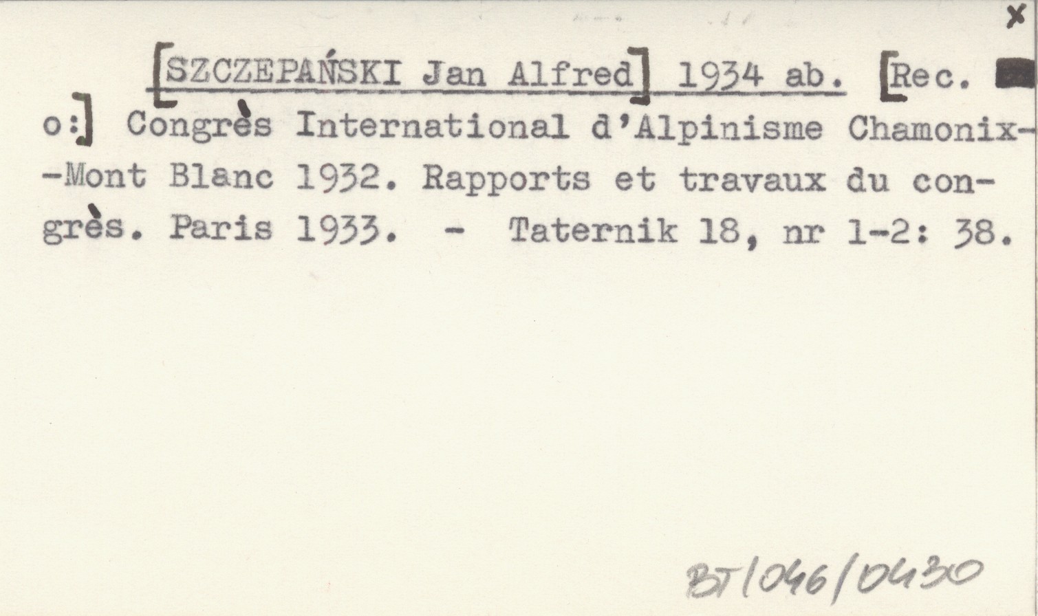 [SZCZEPAŃSKI Jan Alfred] 1934 ab [Rec. o:] Congrés International d'Alpinisme Chamonix-Mont Blanc 1932. Rapports et travaux du congrés. Paris 1933.