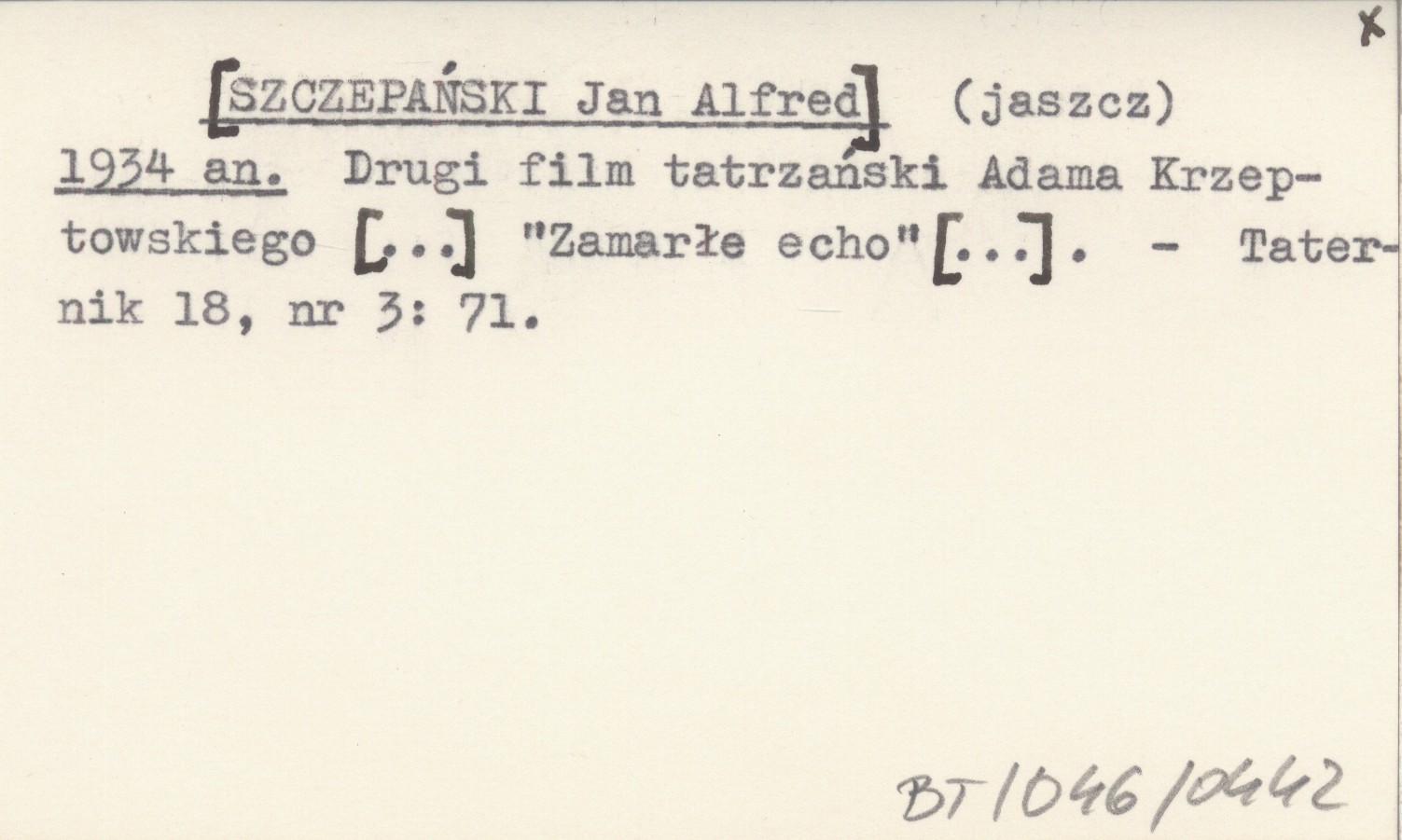 (jaszcz) [SZCZEPAŃSKI Jan Alfred] 1934 an Drugi film tatrzański Adama Krzeptowskiego [...] "Zamarłe echo" [...].