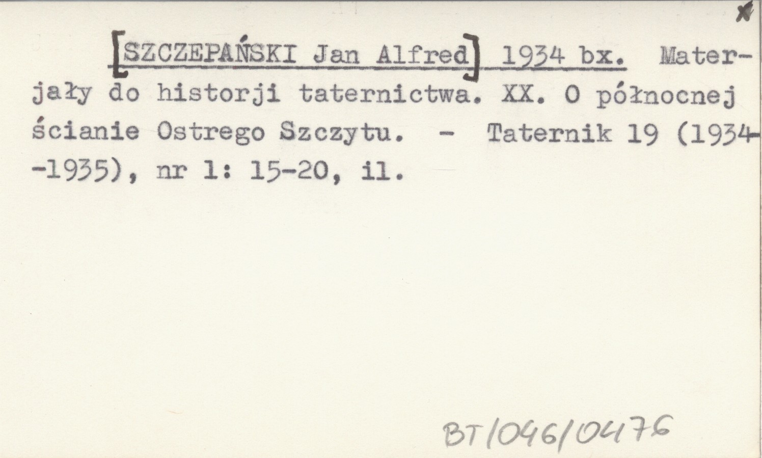 [SZCZEPAŃSKI Jan Alfred] 1934 bx Materjały do historji taternictwa. XX. O północnej ścianie Ostrego Szczytu.