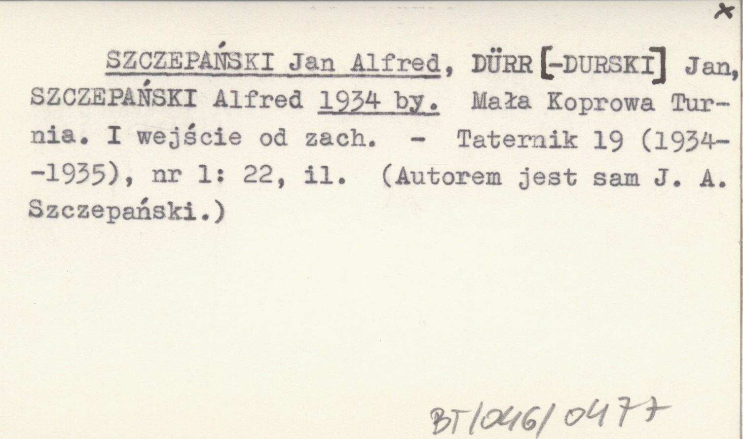 SZCZEPAŃSKI Jan Alfred DÜRR[-DURSKI], Jan. ; SZCZEPAŃSKI, Alfred. ; 1934 by Mała Koprowa Turnia. I wejście od zach.