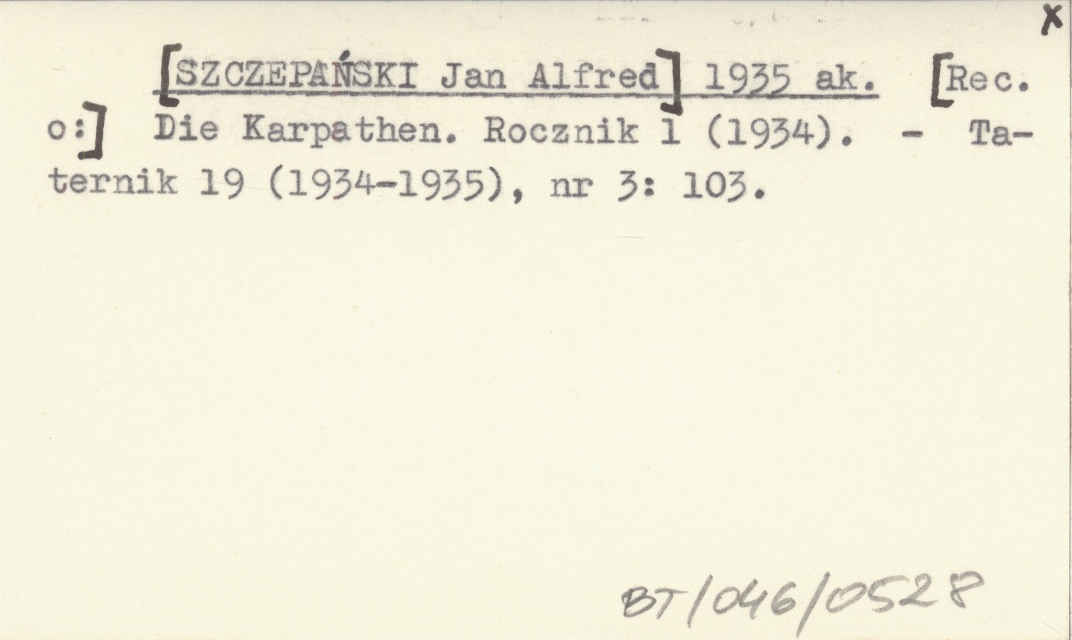 [SZCZEPAŃSKI Jan Alfred] 1935 ak [Rec. o:] Die Karpathen. R. 1 (1934).