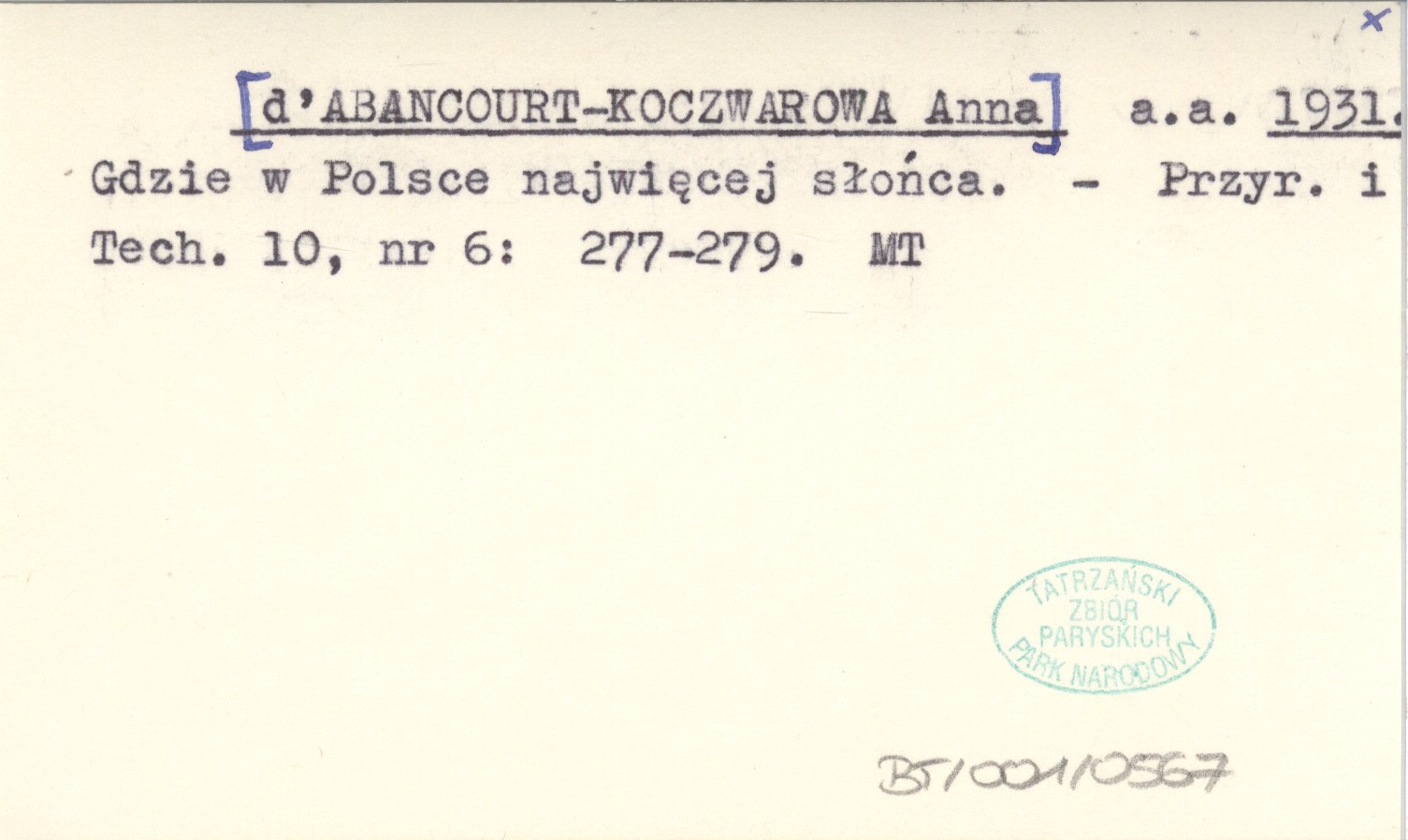 a. a. [d'ABANCOURT-KOCZWAROWA Anna] 1931 Gdzie w Polsce najwięcej słońca.