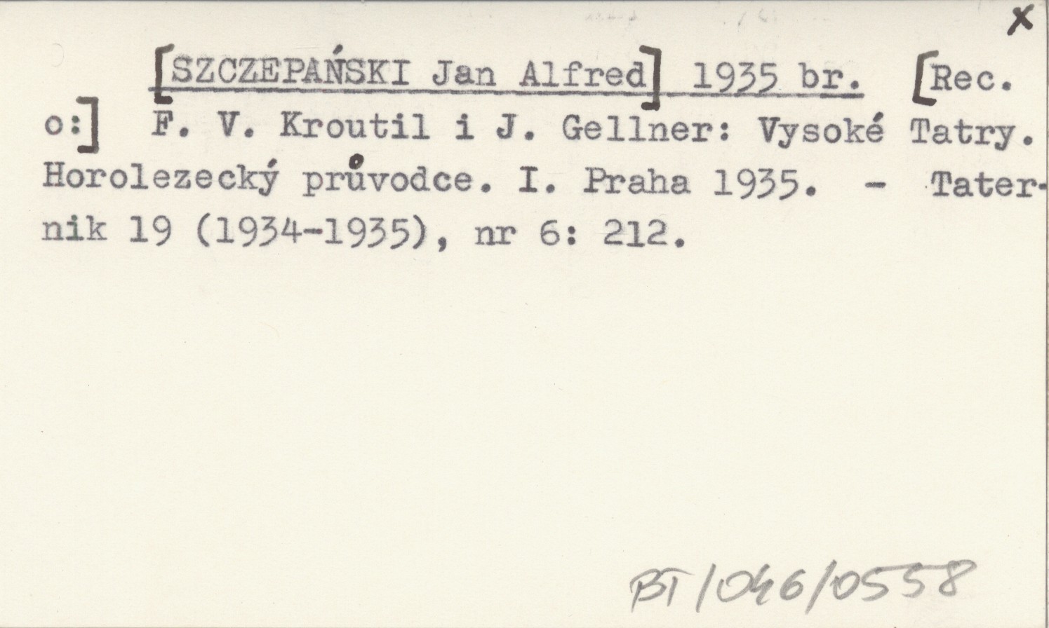 [SZCZEPAŃSKI Jan Alfred] 1935 br [Rec. o:] F. V. Kroutil i J. Gellner: Vysoké Tatry. Horolezecký průvodce. I. Praha 1935.