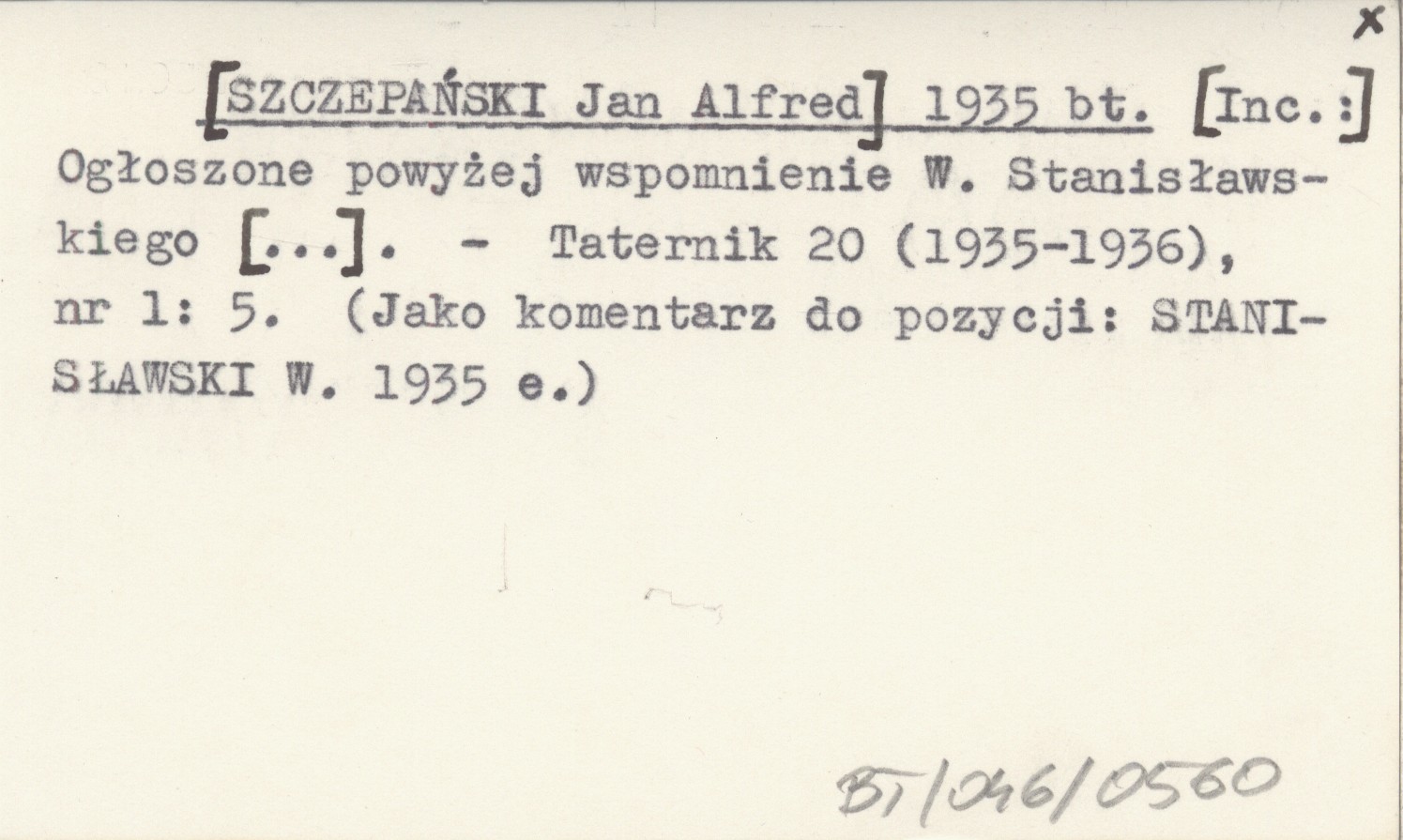 [SZCZEPAŃSKI Jan Alfred] 1935 bt [Inc.:] Ogłoszone powyżej wspomnienie W. Stanisławskiego [...].
