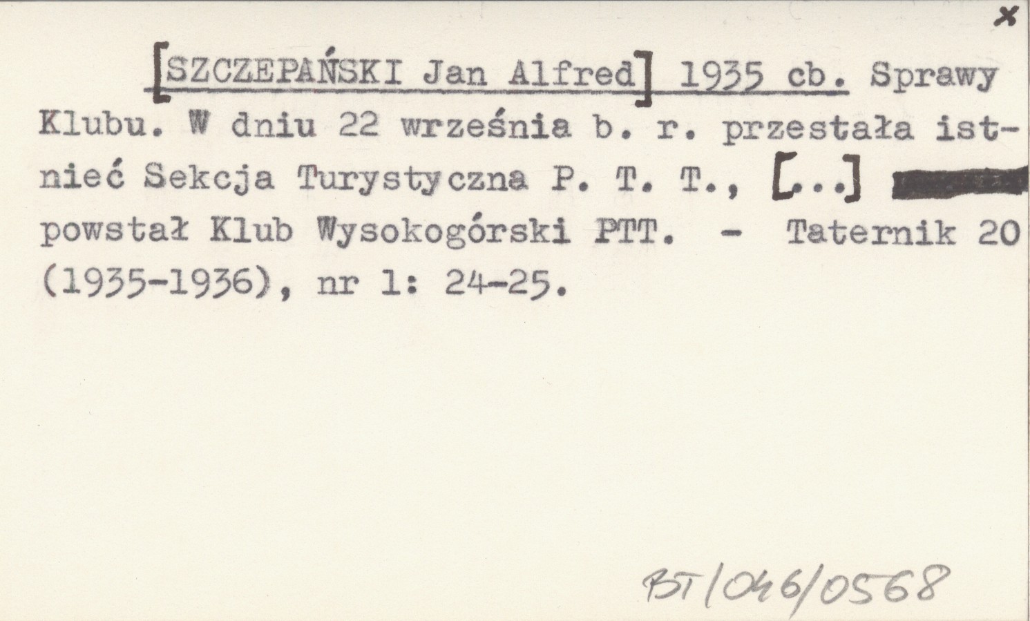 [SZCZEPAŃSKI Jan Alfred] 1935 cb Sprawy Klubu. W dniu 22 września b.r. przestała istnieć Sekcja Turystyczna P.T.T., [...] powstał Klub Wysokogórski PTT.