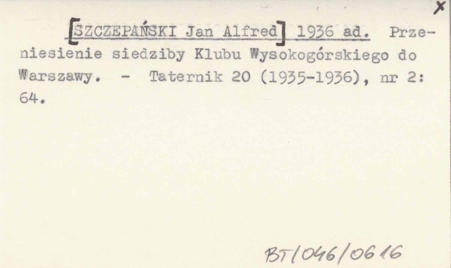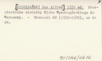 [SZCZEPAŃSKI Jan Alfred] 1936 ad Przeniesienie siedziby Klubu Wysokogórskiego do Warszawy.