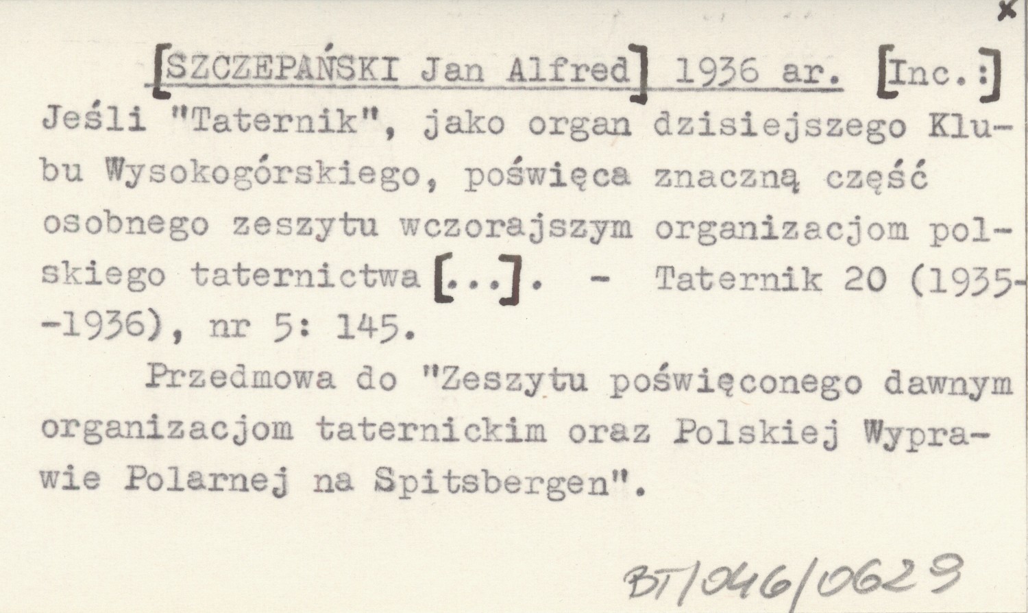 [SZCZEPAŃSKI Jan Alfred] 1936 ar [Inc.:] Jeśli "Taternik", jako organ dzisiejszego Klubu Wysokogórskiego, poświęca znaczną część osobnego zeszytu wczorajszym organizacjom polskiego taternictwa [...].