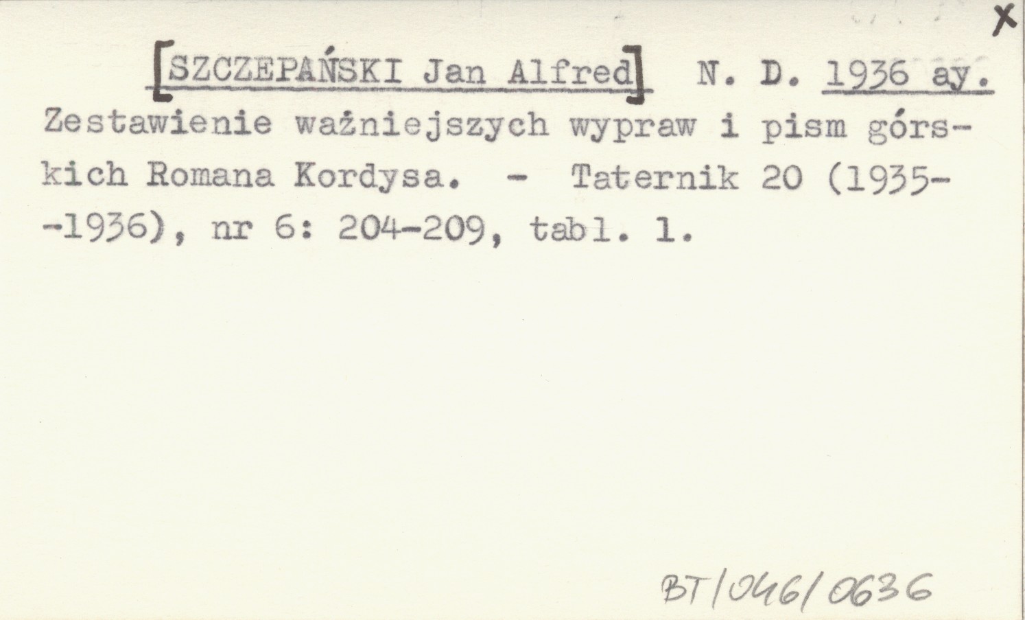 N. D. [SZCZEPAŃSKI Jan Alfred] 1936 ay Zestawienie ważniejszych wypraw i pism górskich Romana Kordysa.