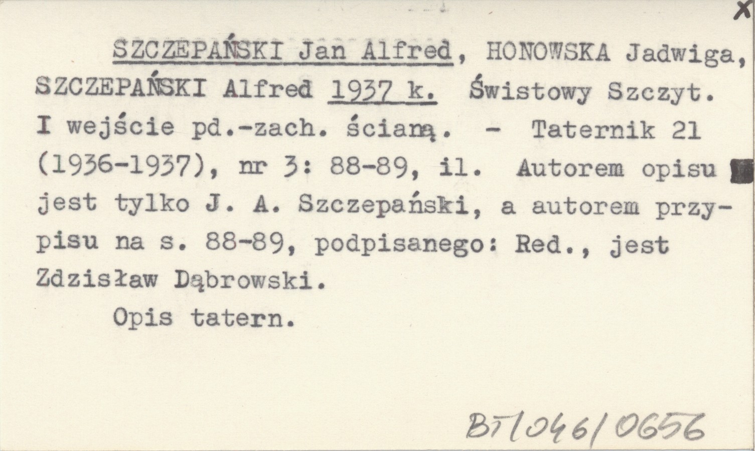 Taternik, 21 (1936-1937), nr 3: 88-89, il. Opis taternicki. Autorem opisu jest tylko J. A. Szczepański, a autorem przypisu na s. 88-89, podpisanego: Red., jest Zdzisław Dąbrowski.
