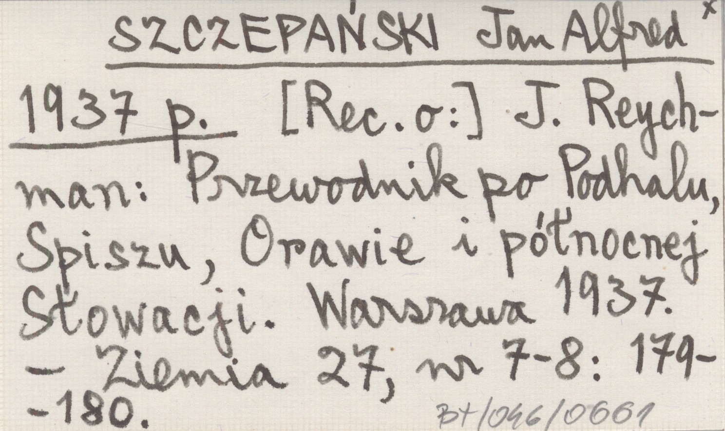 SZCZEPAŃSKI Jan Alfred 1937 p [Rec. o:] J. Reychman: Przewodnik po Podhalu, Spiszu, Orawie i północnej Słowacji. Warszawa 1937.