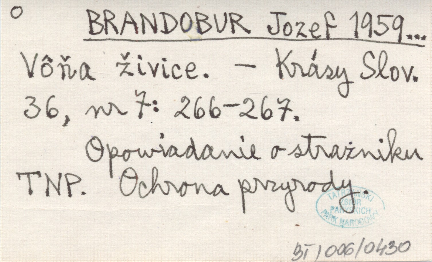 Krásy Slovenska, 36, nr 7: 266-267. Opowiadanie o strażniku TNP. Ochrona przyrody.