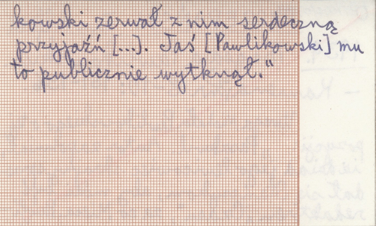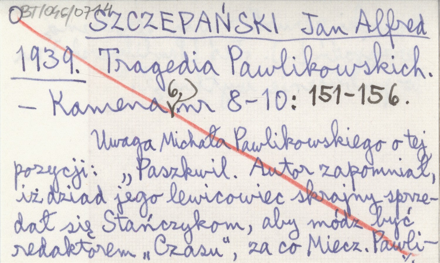 Kamena, 6, nr 8-10: 151-156. Uwaga Michała Pawlikowskiego o tej pozycji: "Paszkwil. Autor zapomniał, iż dziad jego lewicowiec skrajny sprzedał się Stańczykom, aby módz być redaktorem "Czasu", za co Mieczysław Pawlikowski zerwał z nim serdeczną przyjaźń [...]. Jaś [Pawlikowski] mu to publicznie wytknął".