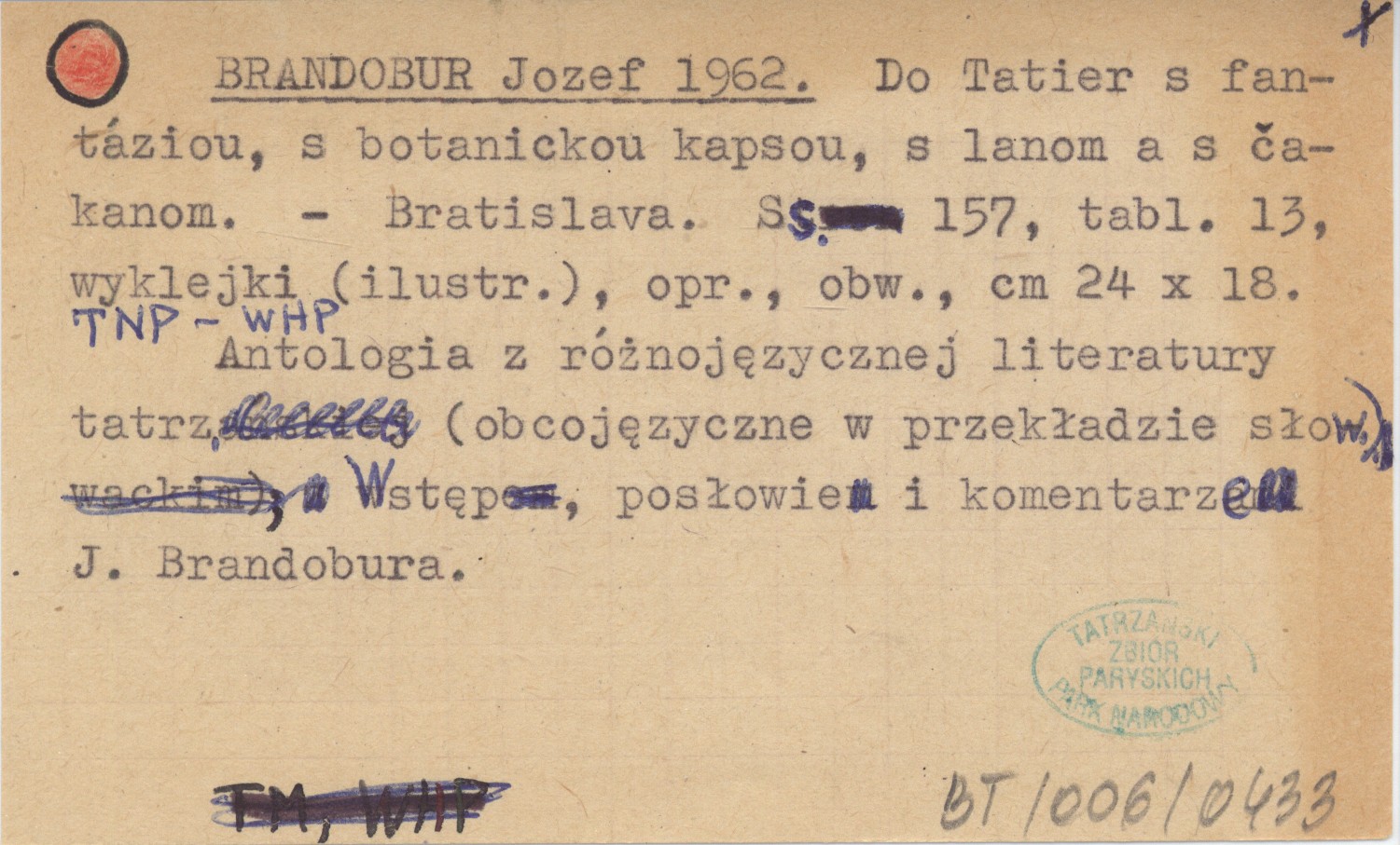 Bratislava , S. 157, 13 k., il., opr., obw., 24x18 cm. Antologia z różnojęzycznej literatury tatrzańskiej (obcojęzyczne w przekładzie słow.). Wstęp, posłowie i komentarze J. Brandobura.