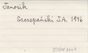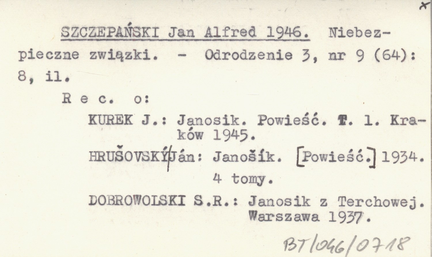 Odrodzenie, 3, nr 9 (64): 8, il. Recenzje o: KUREK J., Janosik. Powieść. T. 1 Kraków 1945 ; HRUŠOVSKÝ Ján, Janošík. [Powieść.] 1934, 4 t. ; DOBROWOLSKI S. R., Janosik z Terchowej. Warszawa 1937.