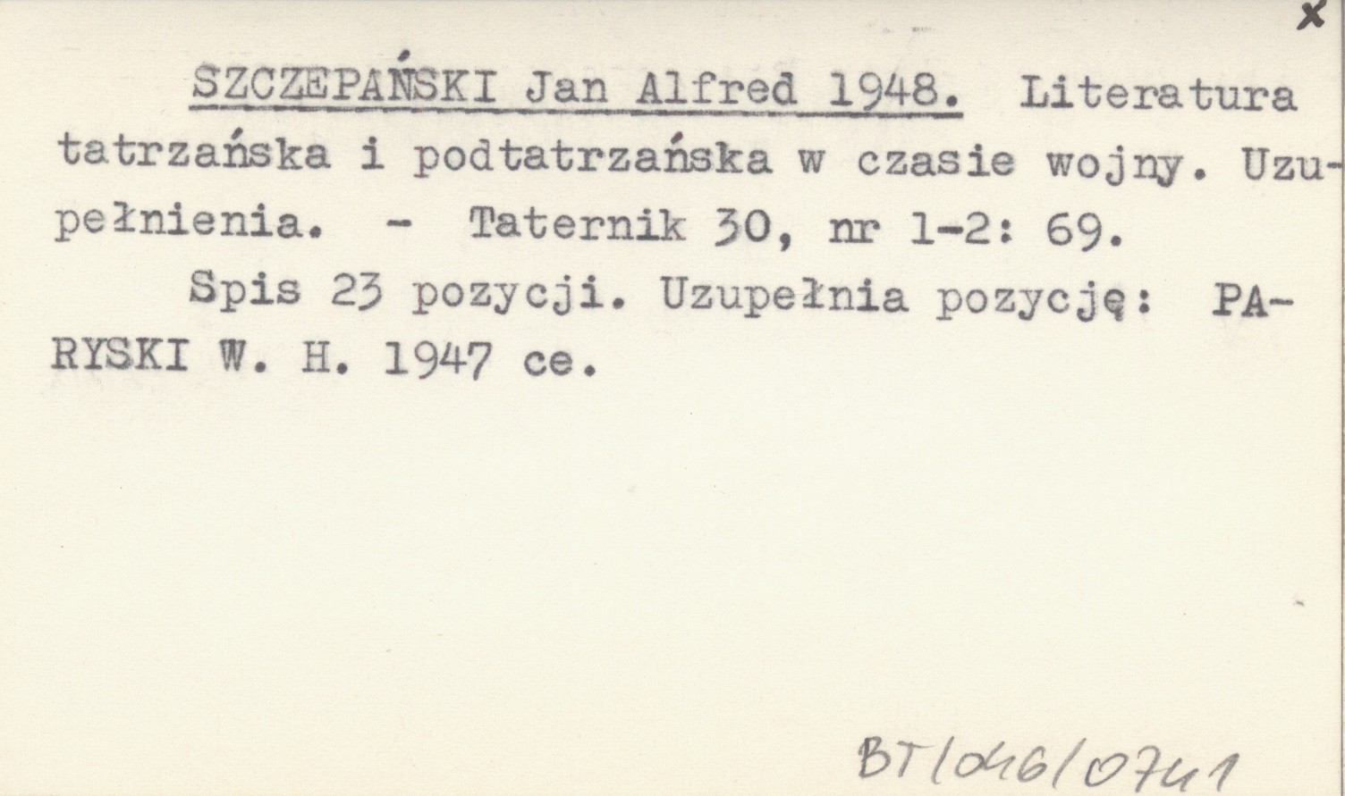 Taternik, 30, nr 1-2: 69. Spis 23 pozycji: Uzupełnia pozycję: PARYSKI W. H. 1947 ce.