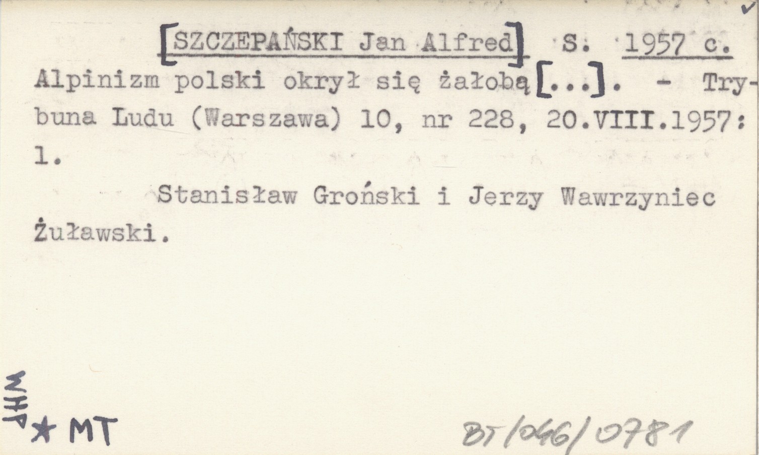 S. [SZCZEPAŃSKI Jan Alfred] 1957 c Alpinizm polski okrył się żałobą [...].