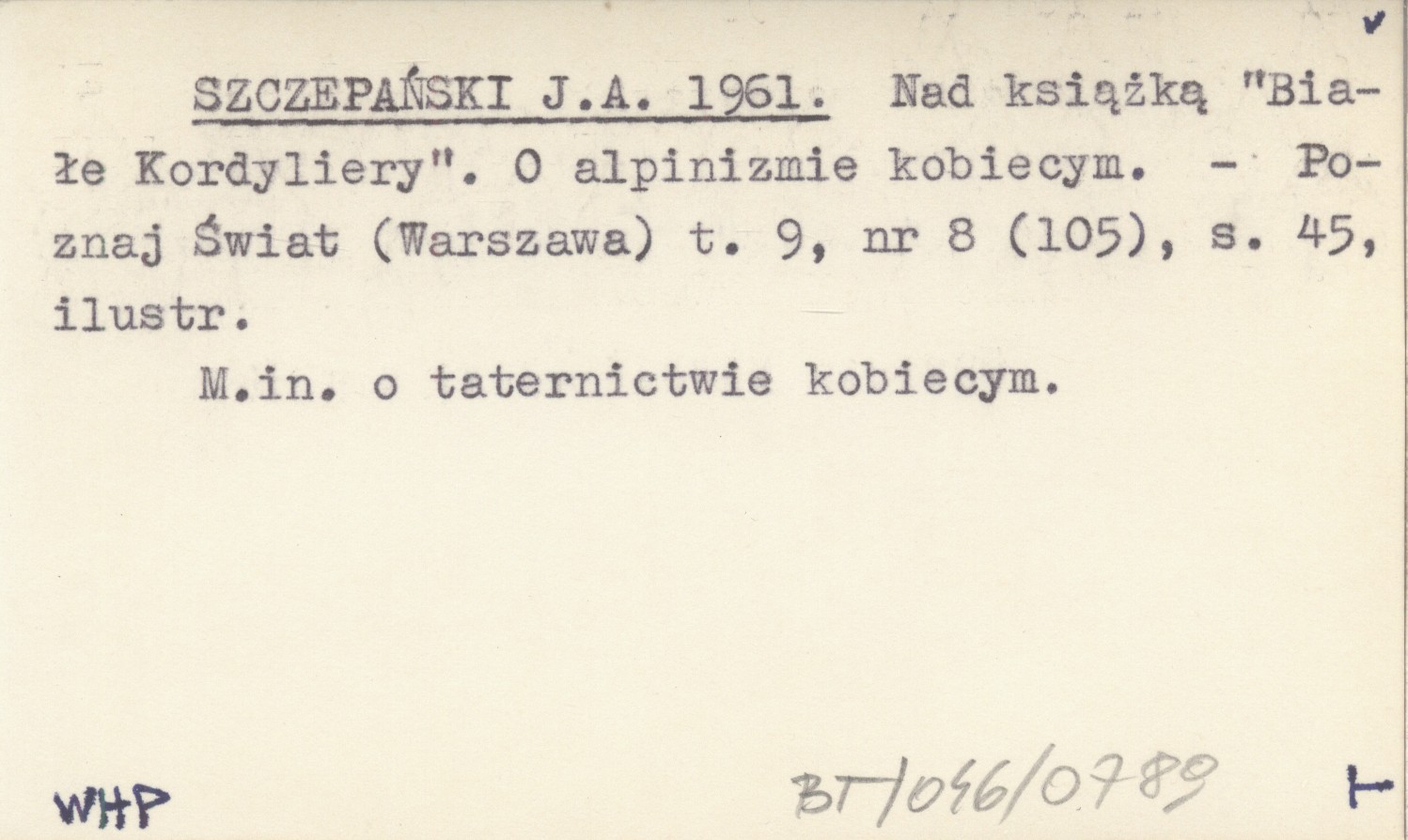SZCZEPAŃSKI J. A. 1961 Nad książką "Białe Kordyliery". O alpinizmie kobiecym.