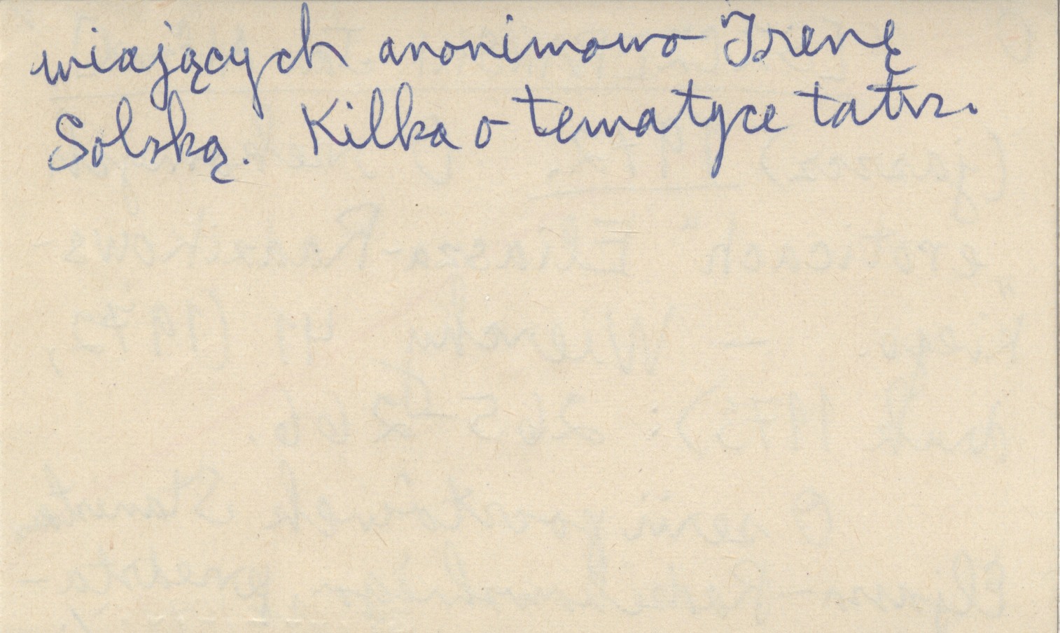 Wierchy, 41 (1972, druk 1973): 265-266. O serii pocztówek Stanisława Eljasza-Radzikowskiego przedstawiających anonimowo Irenę Solską. Kilka o tematyce tatrzańskiej.