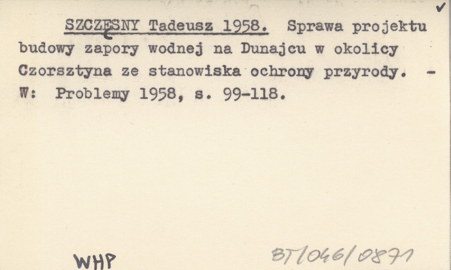 SZCZĘSNY Tadeusz 1958 Sprawa projektu budowy zapory wodnej na Dunajcu w okolicy Czorsztyna ze stanowiska ochrony przyrody.