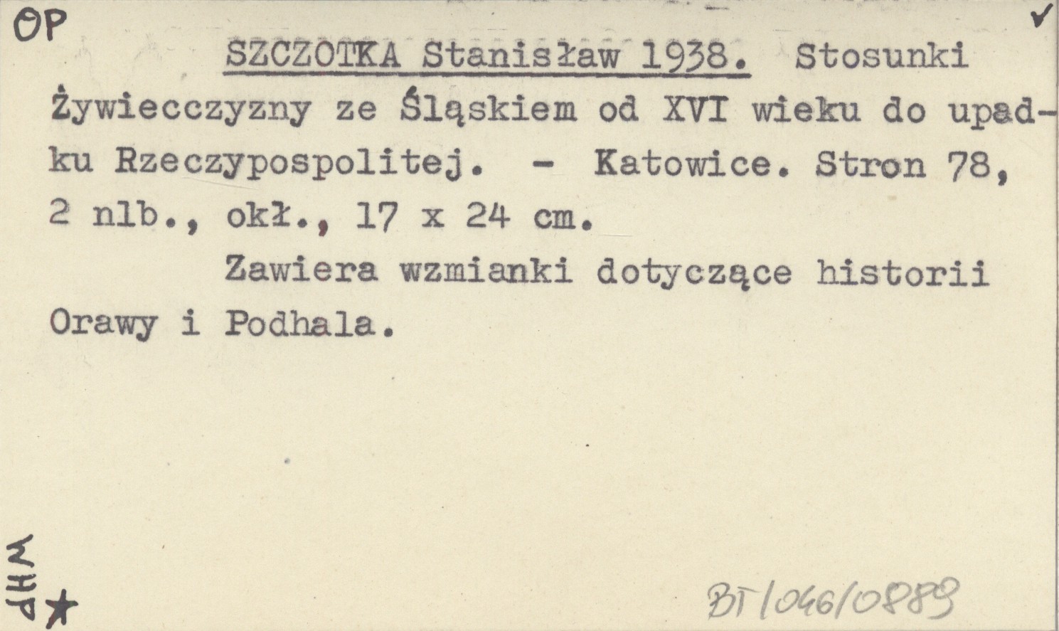 SZCZOTKA Stanisław 1938 Stosunki Żywiecczyzny ze Śląskiem od XVI wieku do upadku Rzeczypospolitej.