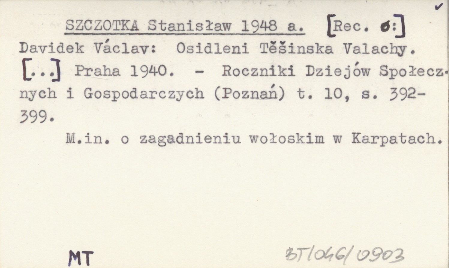 SZCZOTKA Stanisław 1948 a [Rec. o:] Davidek Václav: Osidleni Těšinska Valachy [...] Praha 1940.
